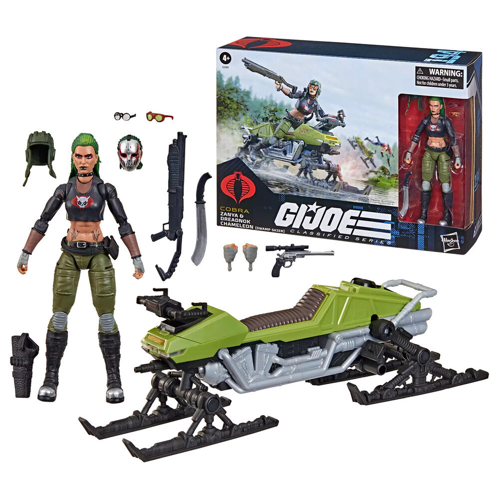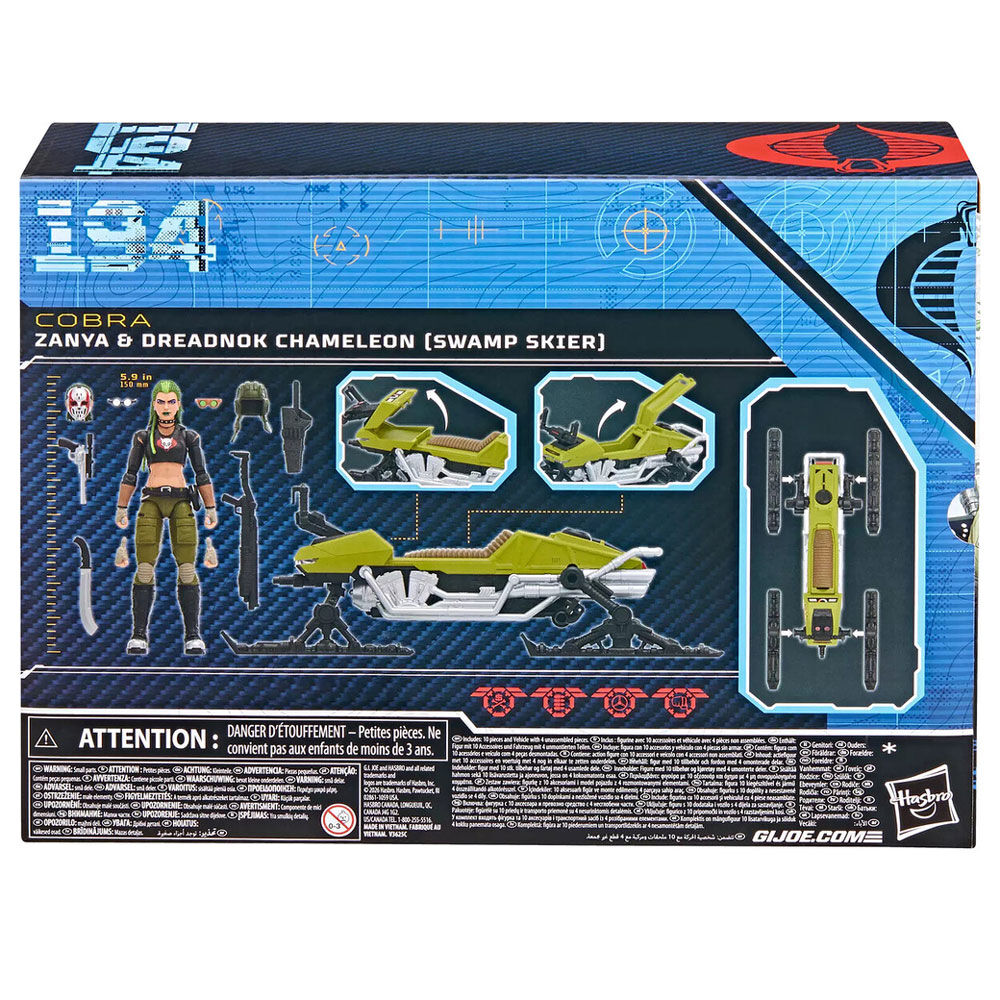 Hasbro incorpora a la línea G.I. Joe Classified Series la figura de Zanya junto al vehículo Dreadnok Chameleon (Swamp Skier), inspirado en el icónico universo de "G.I. Joe". Con una altura de 15 cm presenta un diseño clásico actualizado con acabados premium y múltiples puntos de articulación que permiten recrear dinámicas poses. Incluye: 1x cabeza enmascarada alternativa, 1x casco, 2x pares de gafas, 2x manos adicionales, 1x machete, 1x funda y 2x armas de fuego. El vehículo cuenta con manillar ajustable, esquíes frontales móviles, amortiguadores traseros y compartimentos de almacenamiento ocultos. Se presenta en una caja con ventana numerada como #194 dentro de la colección, con arte e iconografía exclusivos. UNIDADES LIMITADAS.