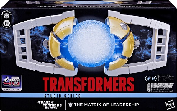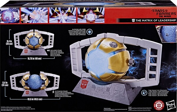 Hasbro celebra el 40º aniversario de "Transformers: The Movie con la réplica interactiva de La Matriz de Liderazgo dentro de la colección Studio Series. Este artículo de colección tiene una altura de 24 cm e incorpora luces LED y sonido para una experiencia cinematográfica. El marco extensible permite exhibirla abierta (49,5 cm de ancho) o cerrada (40 cm). Al abrirse, el núcleo luminoso LED intensifica su brillo y reproduce la canción "The Touch" de Stan Bush. Incluye 1x base de exhibición y requiere 2x pilas AA (no incluidas). Se presenta en una caja ilustrada. UNIDADES LIMITADAS